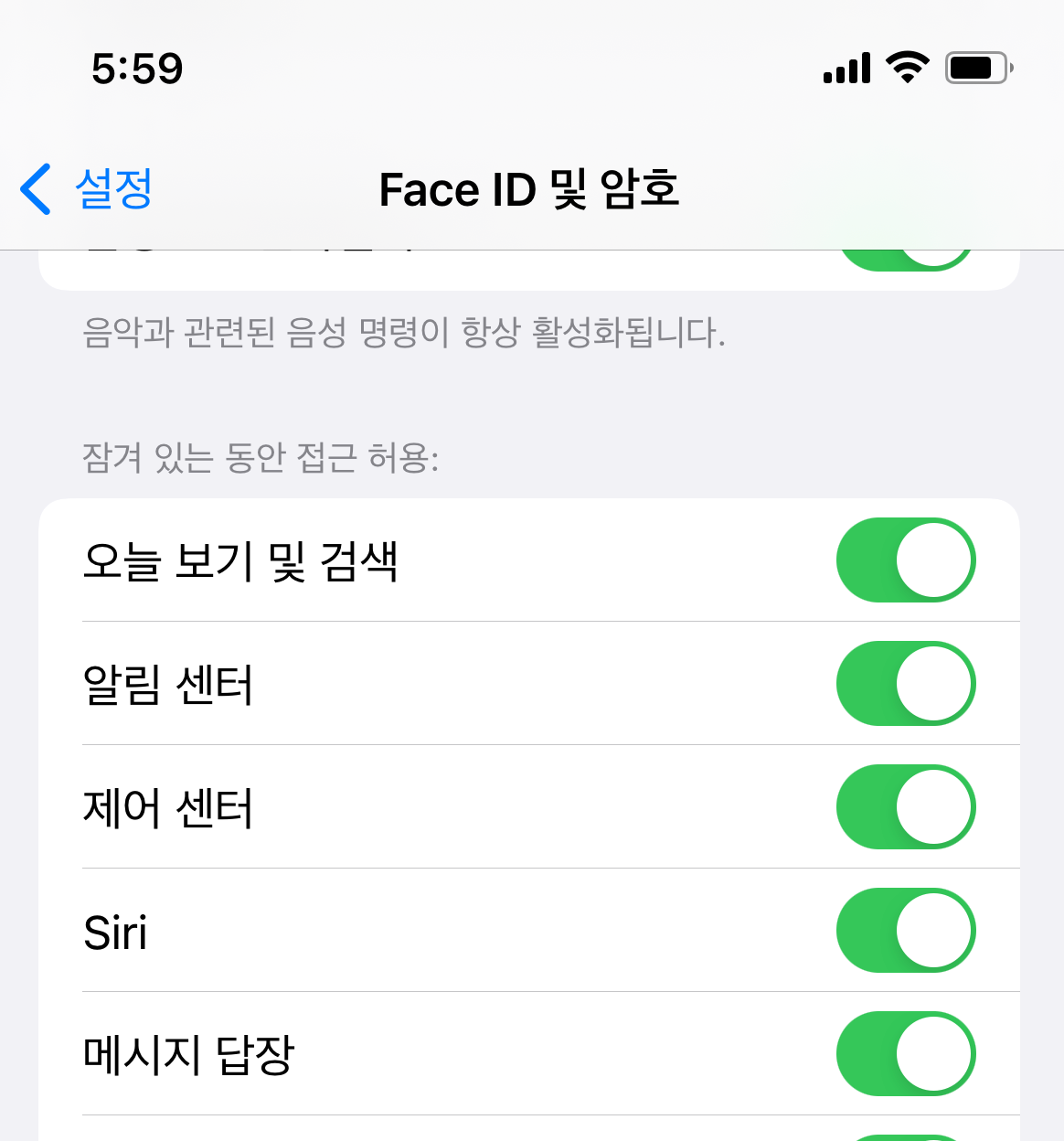 그런 다음 "잠겨 있는 동안 접근 허용" 섹션에서 "제어 센터"를 끈다.