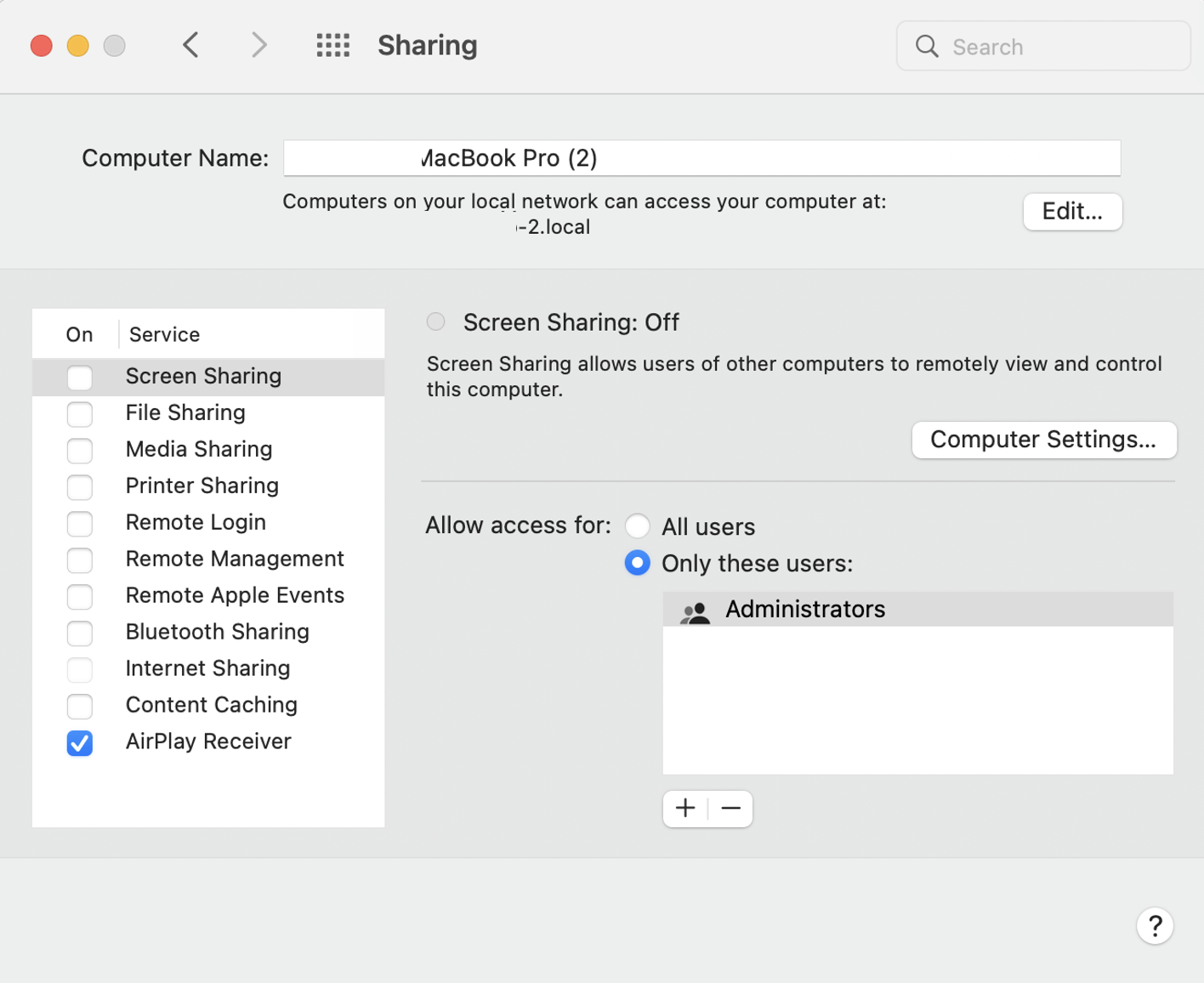 시스템 환경 설정 > 공유로 이동하고 에어플레이 수신 옆에 있는 확인란을 선택한다. 오른쪽 섹션에서 암호 확인을 선택하지 않고 새 기기가 아닌 맥북에 에어플레이를 할 수 있도록 암호 필요를 선택 해제한다. 원하는 경우 에어플레이 허용 옆이 있는 모두를 선택하여 근처에 있는 모든 사람이 이 맥북을 에어플레이 대상으로 볼 수 있도록 한다.