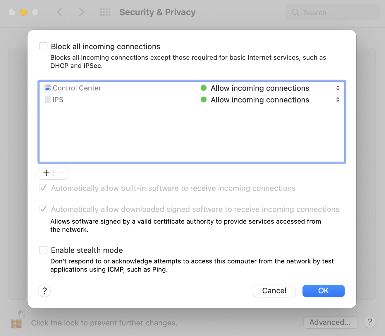 이제 모든 들어오는 연결 차단 옵션의 선택을 취소하고 다운로드한 서명된 소프트웨어가 들어오는 연결을 수신하도록 자동으로 허용을 선택한다. 마지막으로 확인을 눌러 변경 사항을 저장한다.