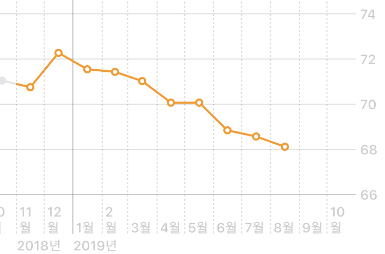 나름대로 꾸준히 운동을 하고 보니 눈에 띄는 부분은 체중에 대한 부분이다. 과 체중은 아니지만 움직임에 몸이 둔하다고 생각되어 올해 안에 68kg을 만드는 것을 목표로 두었다. 반년이 지나간 시점인데 이미 달성하였다.