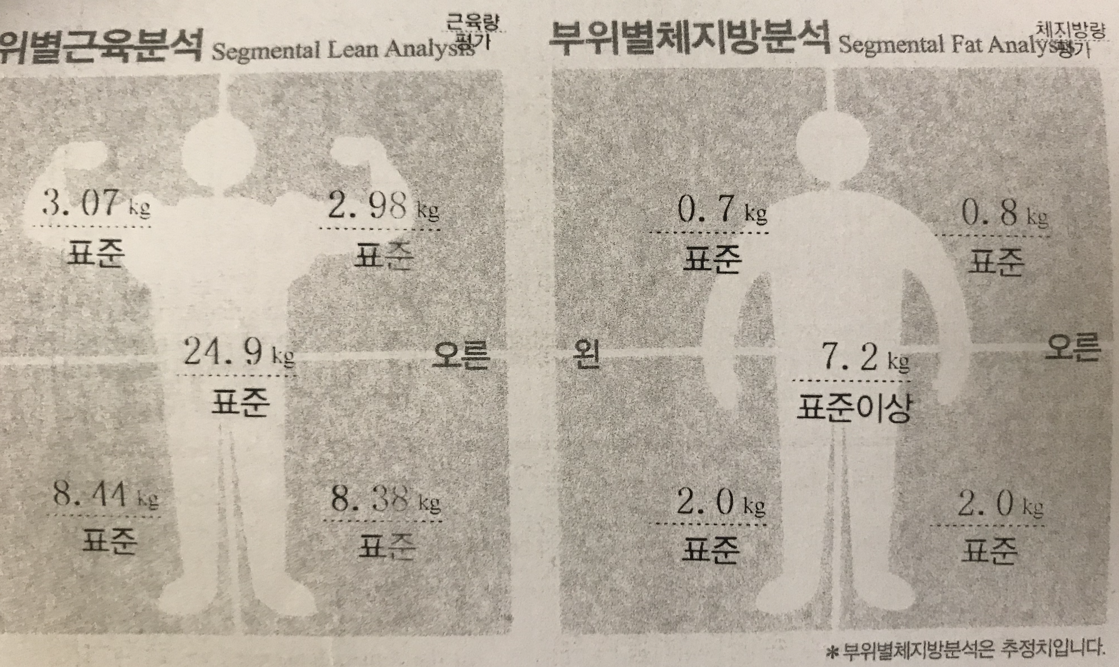 기본적인 검사 항목들은 비슷하거나 약간 좋아진 경향이 있다. 지난번 건강검진 당시만 해도 워낙 모든 몸의 조건이 바닥이 상태여서 이번에는 개선된 부분들이 있었다. 근육 부족은 바로 개선해야 하기로 마음먹었다.