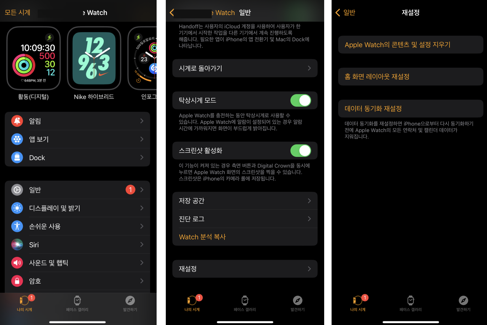 그래도 디지털 크라운이 작동하지 않으면 애플워치를 재설정하는 것이 남았다. 이렇게 하면 변경한 모든 watchOS 설정과 여기에 저 정 된 데이터가 지워진다. 따라서 필요한 데이터가 있다면 미리 데이터를 백업해 두어야 한다.