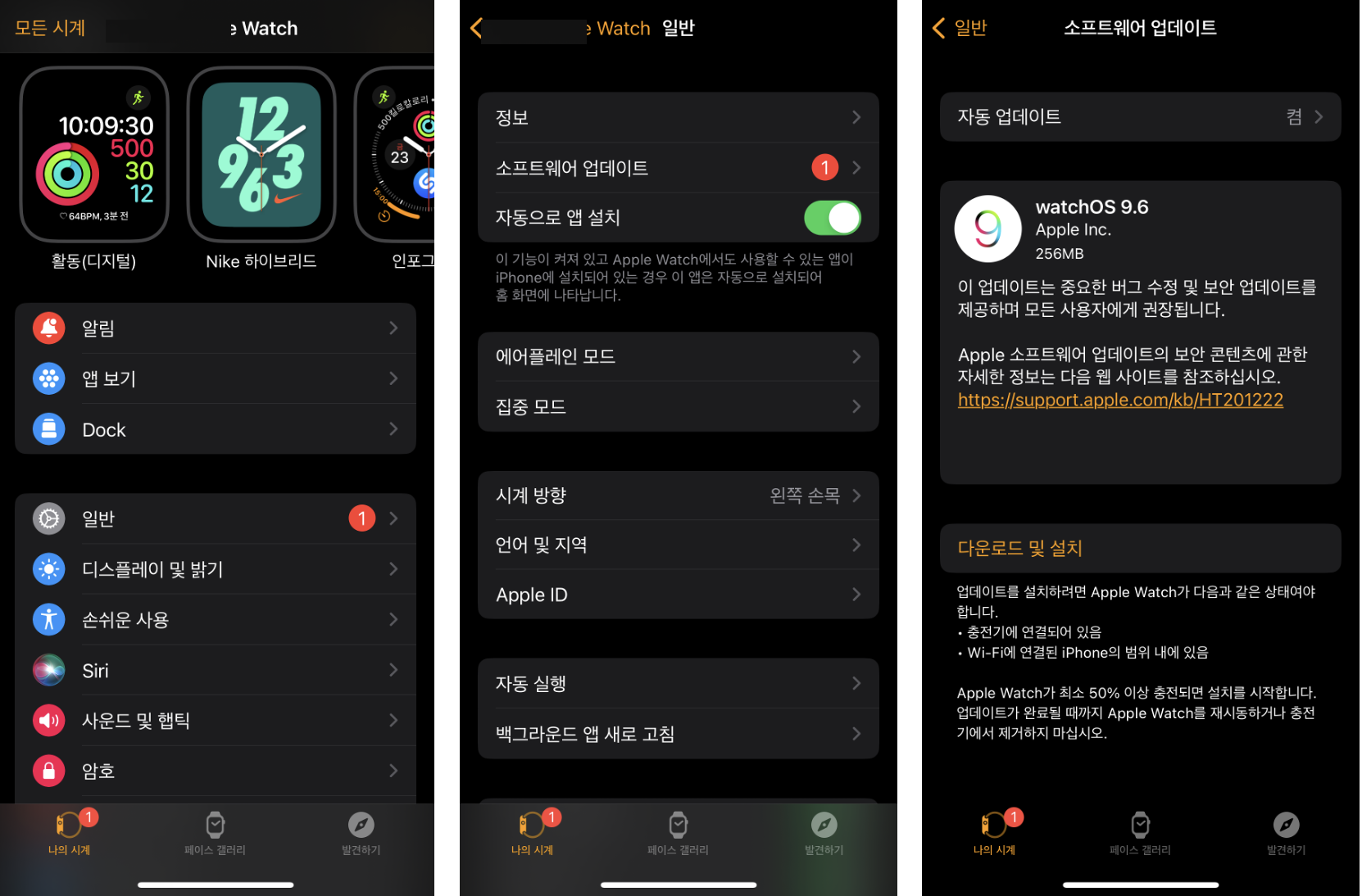 워치 앱의 일반> 소프트웨어 업데이트를 선택하여 새 watchOS 버전을 확인한다. 애플워치가 watchOS 6 이상은 경우 워치 자체에서 설정> 일반> 소프트웨어로 이동하여 아이폰 없이 워치 자체를 업데이트할 수 있다.