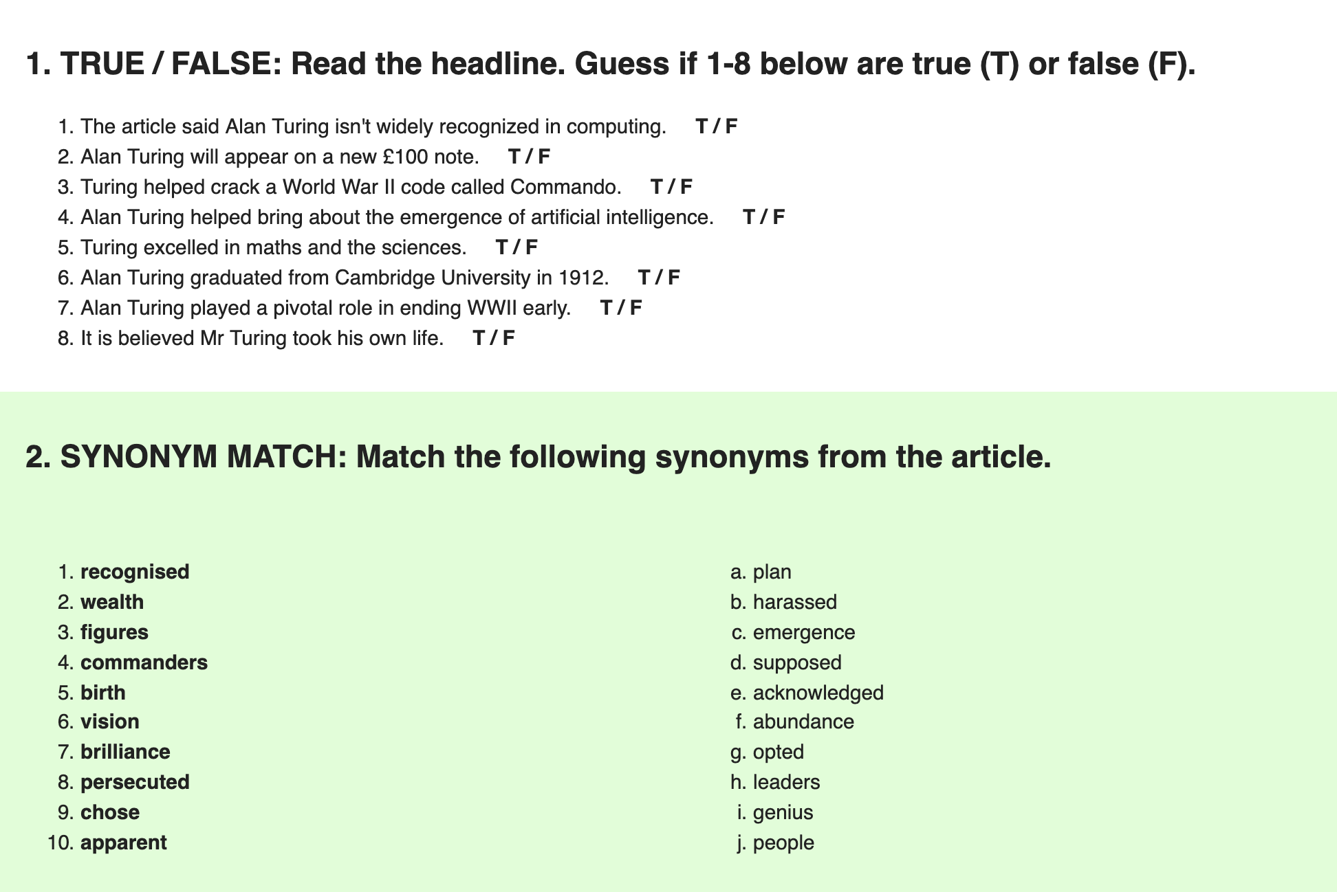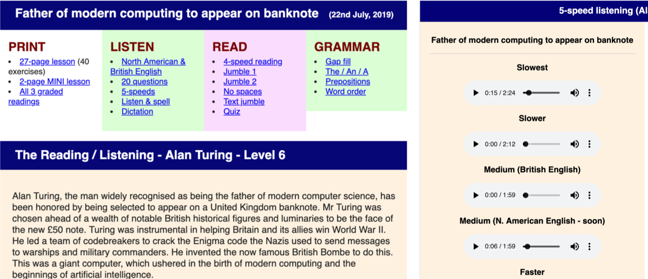 예를 들어 Father of merdern computing to appear on banknote라는 내용을 살펴보겠습니다. 각 Level에 따라 동일한 기사의 내용에 어휘 수준 등이 변경하여 학습할 수 있도록 합니다. 상세 내용으로 들어가 보면 짧게 정리된 기사 내용과 함께 추가적인 학습을 위한 여러 도구들이 있습니다. 물론 리스닝을 위한 음성 파일이 있으며 무료로 다운로드할 수 있습니다.