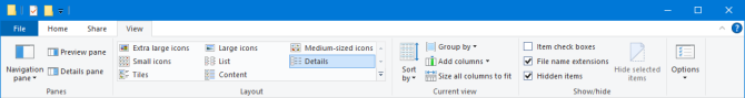 마지막으로 파일 탐색기를 조정하여 데이터를 보다 잘 이해할 수 있습니다. 리본 메뉴에서 보기 탭으로 전환하십시오. 여기에서 다양한 정렬 방법을 선택하고 세부 정보 창을 활성화하고 레이아웃 등을 변경할 수 있습니다. 자신에게 맞는 것을 찾아낼 때까지 이러한 옵션을 사용하십시오. 폴더 별로 변경할 수도 있습니다. 예를 들어 큰 아이콘 레이아웃은 사진 폴더에 적합하지만 목록은 문서에 더 적합합니다.