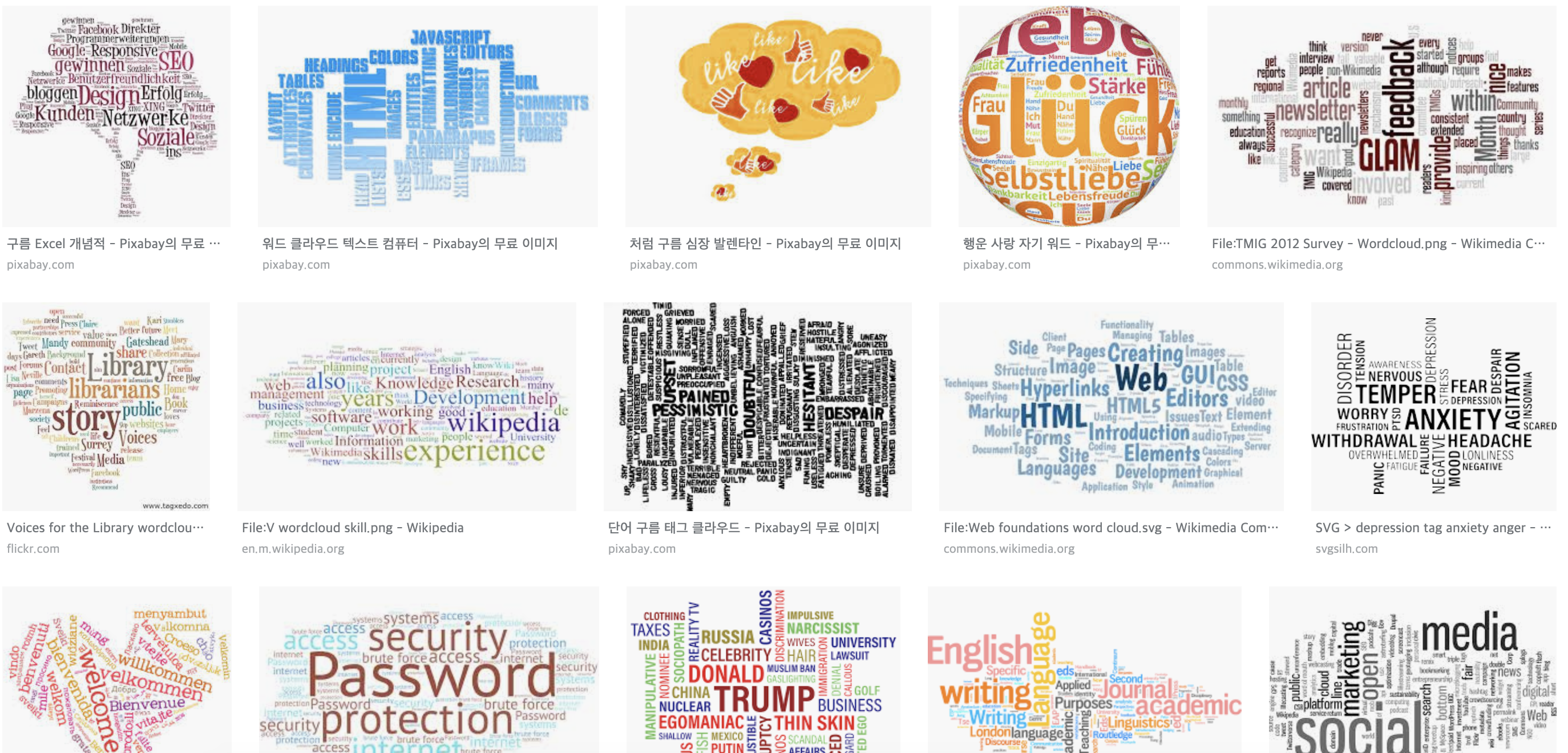 상용화 툴을 이용해 고급스러운 형태로 구성이 가능하겠지만 소개하고자 하는 내용은 무료로 이용할 수 있는 World Cloud입니다. 먼저 네이버, 구글 등의 검색엔진을 통해 Word Cloud를 검색해보면 다양한 형태를 살펴보실 수 있습니다.