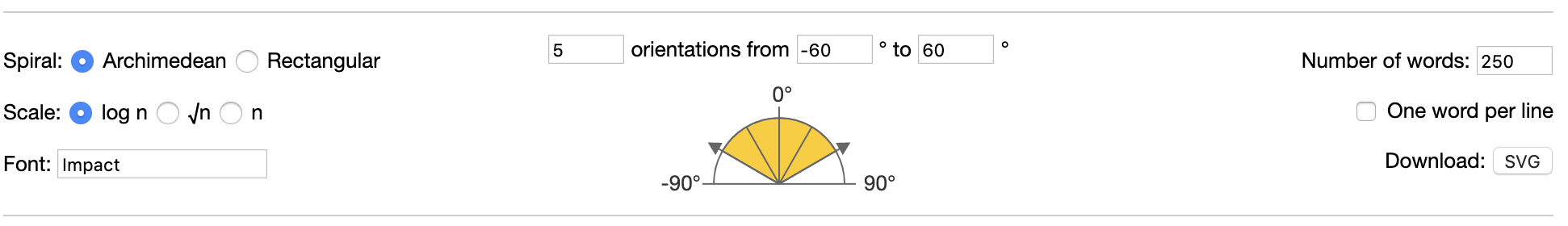 데이터를 입력하는 부분 하단에는 몇 가지 생성한 워드 클라우드를 변경할 수 있는 툴이 있습니다. 나선형, 스케일 조정 및 생성된 워드의 각도를 변경할 수 있습니다.