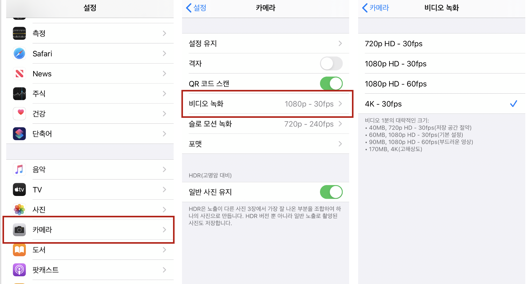 캡처한 화면은 아이폰 7에서 보이는 설정 항목이고 최근의 아이폰에서는 다음과 같습니다. 기준은 비디오 1분의 대략적인 크기를 나타냅니다.