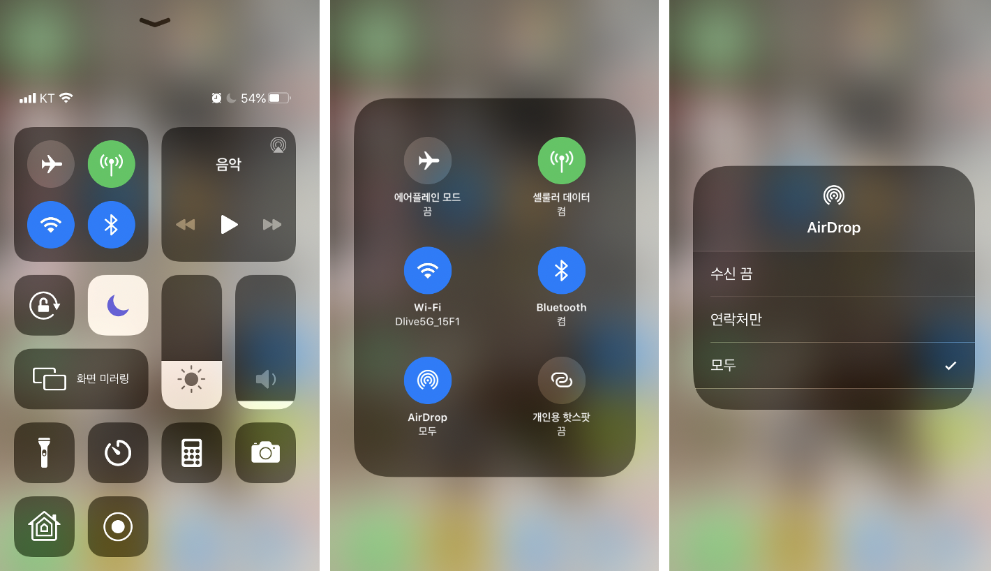 에어드롭을 사용하려 나를 찾을 수 있는 사람을 선택하려면 제어센터의 왼쪽 상단 섹션에 있는 네트워크 설정을 길게 눌러 더 많은 옵션을 선택합니다. 그리고 에어드롭을 탭 하여 연락처만 또는 모두를 선택합니다.