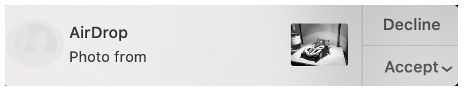 다른 사람에게 파일을 에어드롭으로 전달하면 전송이 시작되기 전에 파일을 수락하거나 거부할 수 있습니다. 마찬가지로 다른 사람이 맥북에 파일을 에어드롭을 통해 전송하는 경우 알림에서 수락을 클릭해야 합니다.