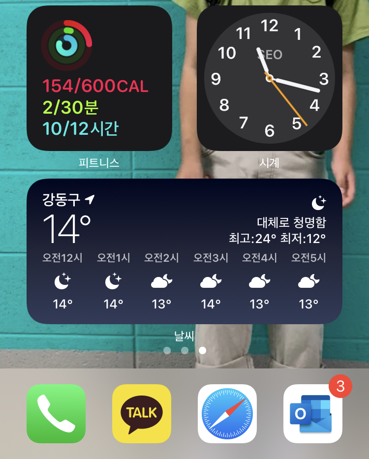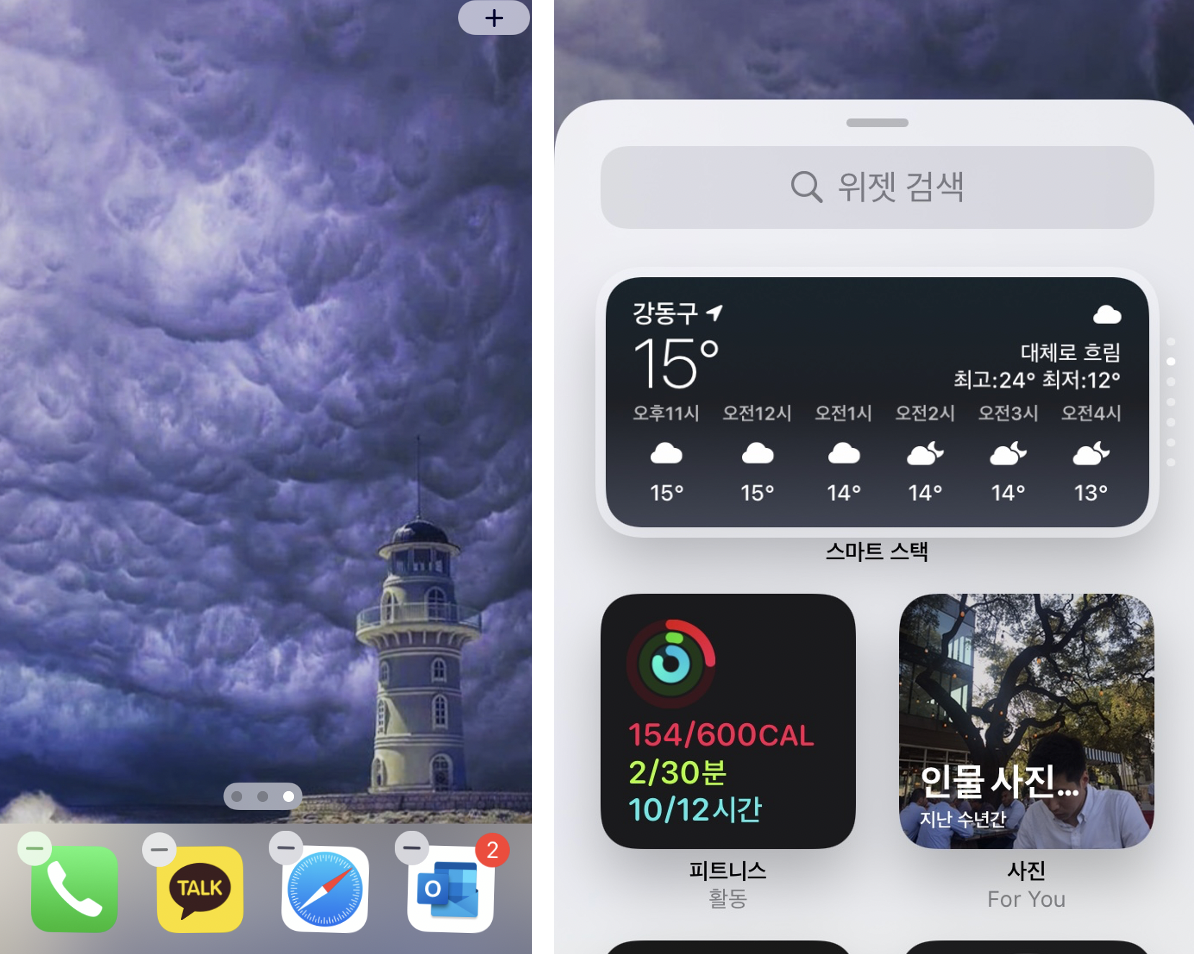 위에 선택한 날씨 위젯은 스마트 스택입니다. 해당 위젯을 위나 아래로 쓸면 다른 위젯으로 변경이 가능합니다.