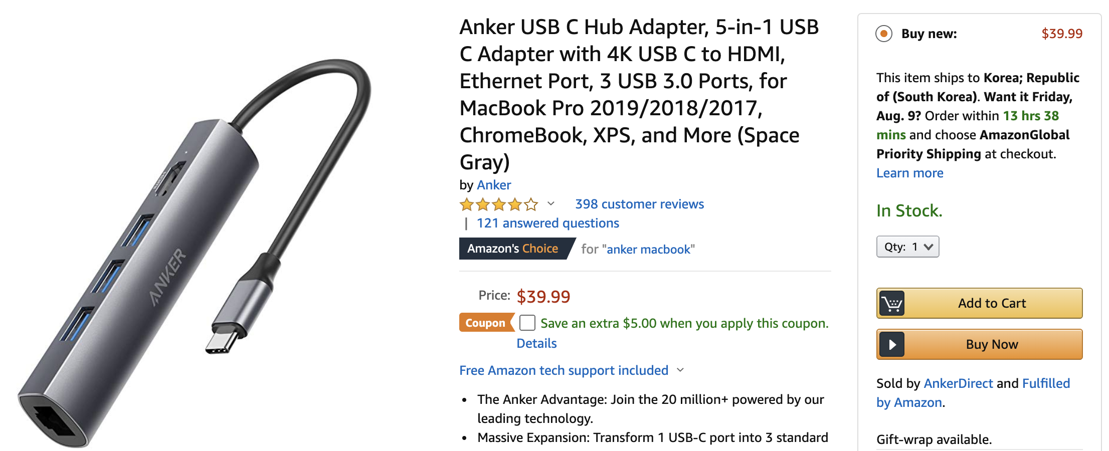 언제부터인지는 모르겠지만 지금은 한국으로 배송이 가능한 상태입니다. 맥북 어댑터로 적절한 가격과 딱 필요한 기능을 내장한 제품을 생각하신다면 고려해보셔도 좋겠습니다.