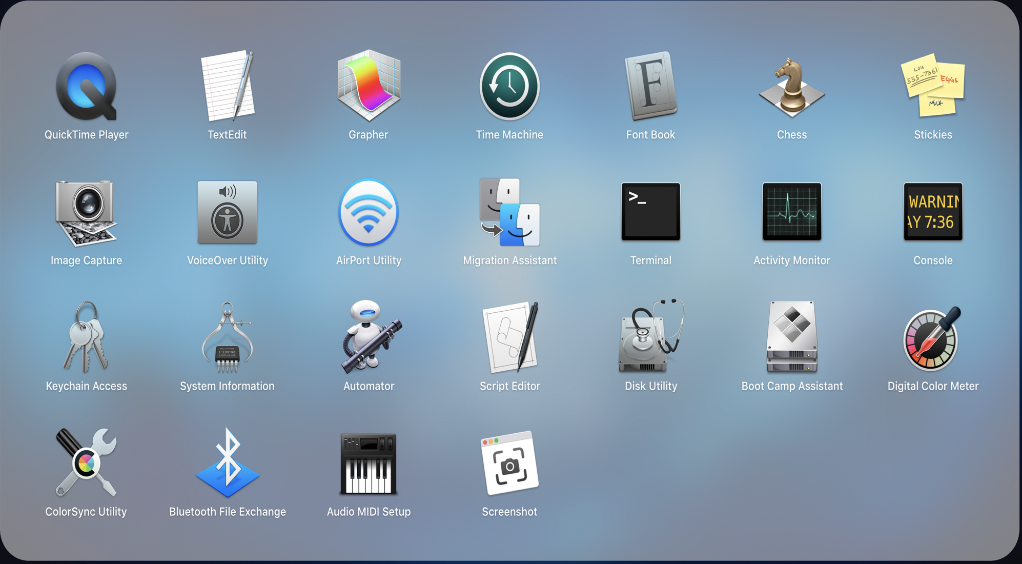 런치패드 아이콘을 클릭하거나 트랙패드의 제스처를 이용하면 다음과 같은 실행할 수 있는 프로그램 목록이 나타난다. 여기서 기타(Other)를 클릭하면 여러 가지 프로그램 목록이 있고 스크린 샷 항목이 있다.