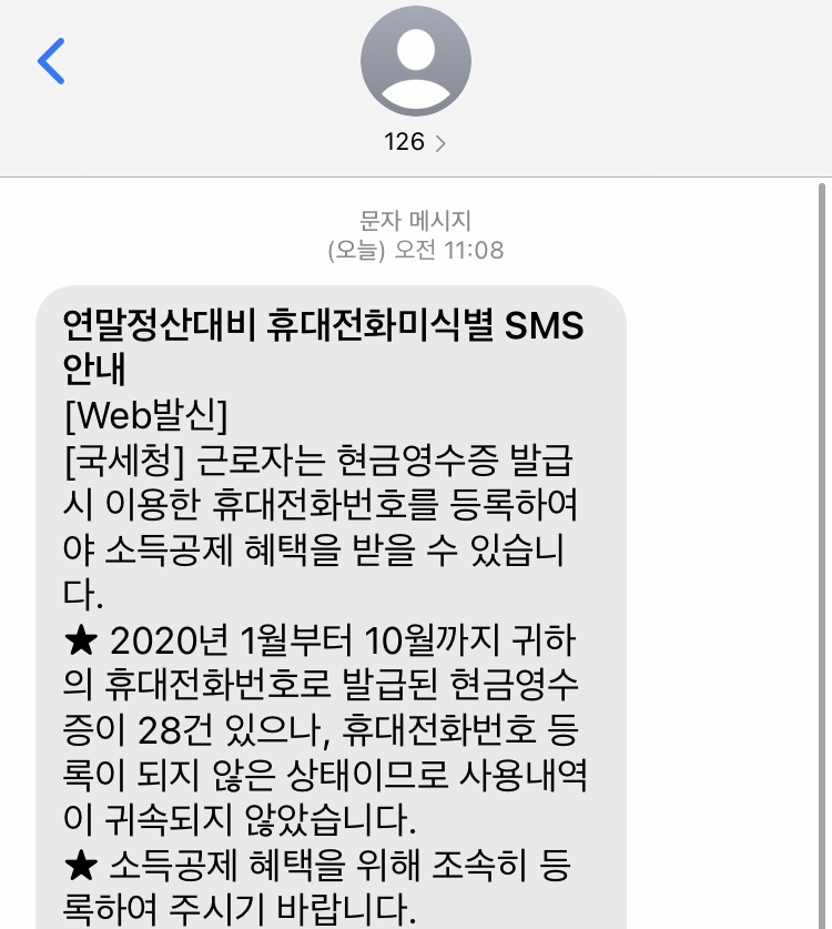2020년도 얼마 남지 않았다. 2021년 새해가 되면 늘 해온던 연말 정산을 수행할 시기가 된다. 국세청으로 부터 아래와 같은 문자를 받았다. 사실 오늘 변경을 하였지만 이전에 사용하던 번호로 꾀나 오래 사용했었기 때문에 그동안 휴대폰 번호로 했던 것은 전부 누락이었구나 싶었다. 올해가 가기전에 금액이 크던 작던 28건에 대한 소득 증빙을 위해 꼭 필요한 과정이라고 생각한다.