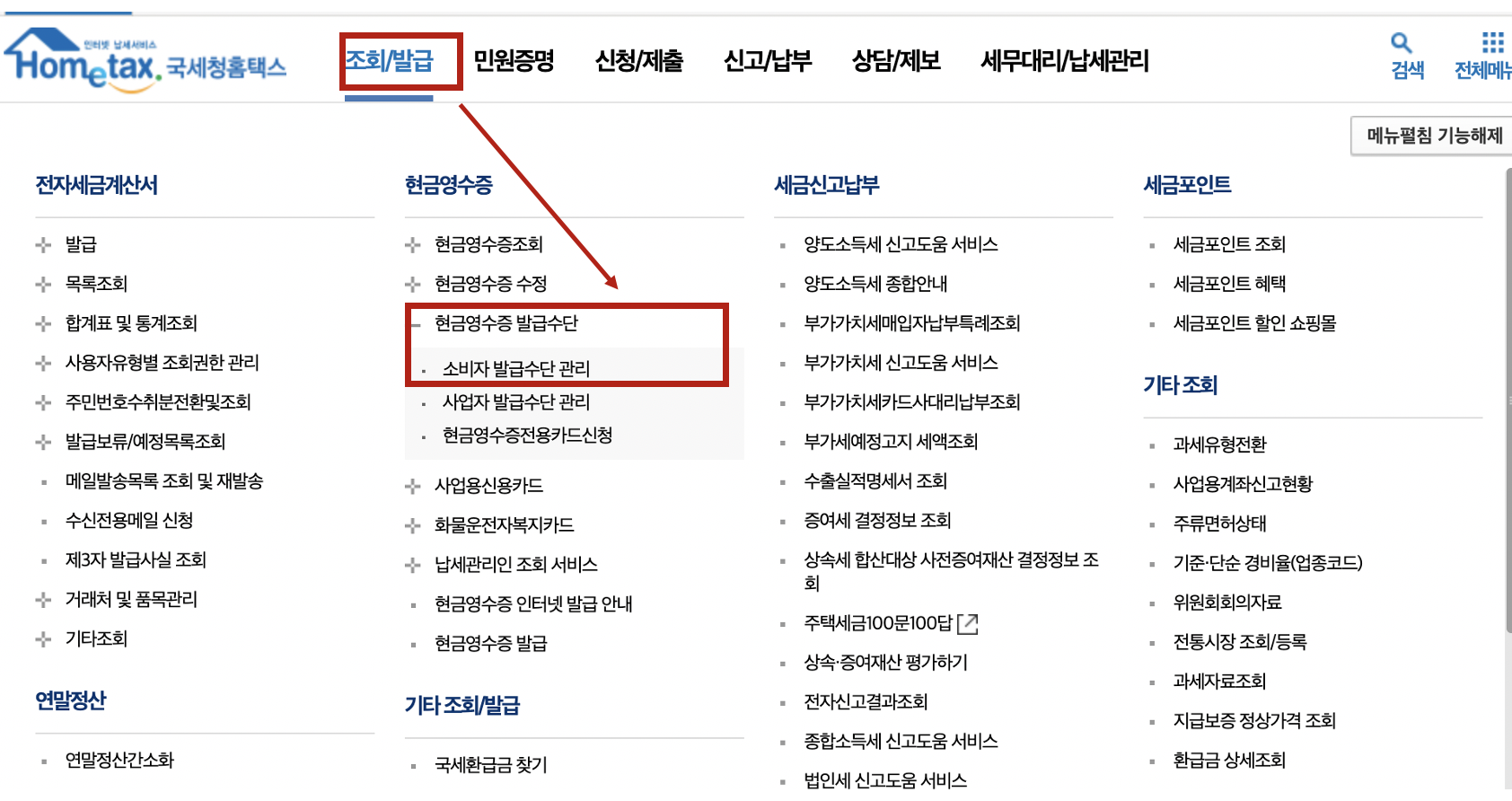 로그인 > 조회/발급 > 현금영수증 > 현금영수증 발급수단