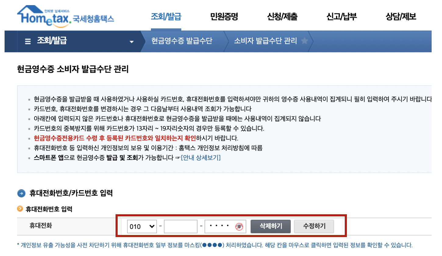 정상적으로 로그인을 하였다면 아래와 같이 소비자 발급수단 관리가 보이고, 휴대전화번호가 나타난다. 여기서 변경할 번호를 선택하고 수정하기를 선택하면 된다. 그외에 기존에 현금영수증 카드를 발급 받은 이력이 있다면 하단부에 정보가 함께 나타난다.