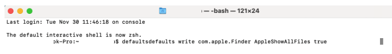 - defaults write com.apple.Finder AppleShowAllFiles true를 입력하고 엔터를 친다.