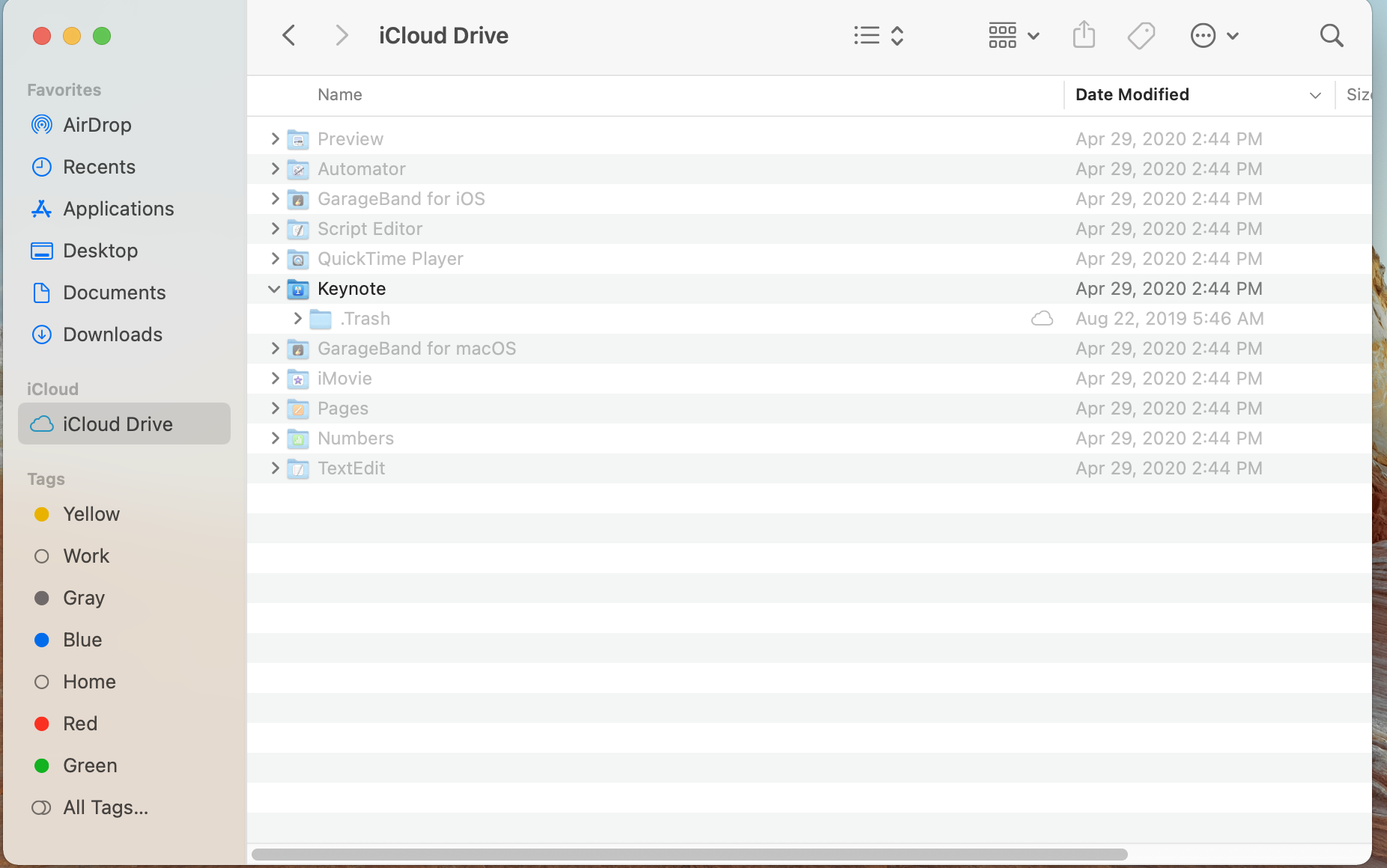 예를 들어 Finder에서 현재 iCloud Drive에 위치해있다. 여기에서 ' Command + Shift +. '을 눌러 숨김 파일을 표시한다. 이는 Document, Applications 및 Desktop 폴더 내에서도 동일한 작성을 수행할 수 있다.