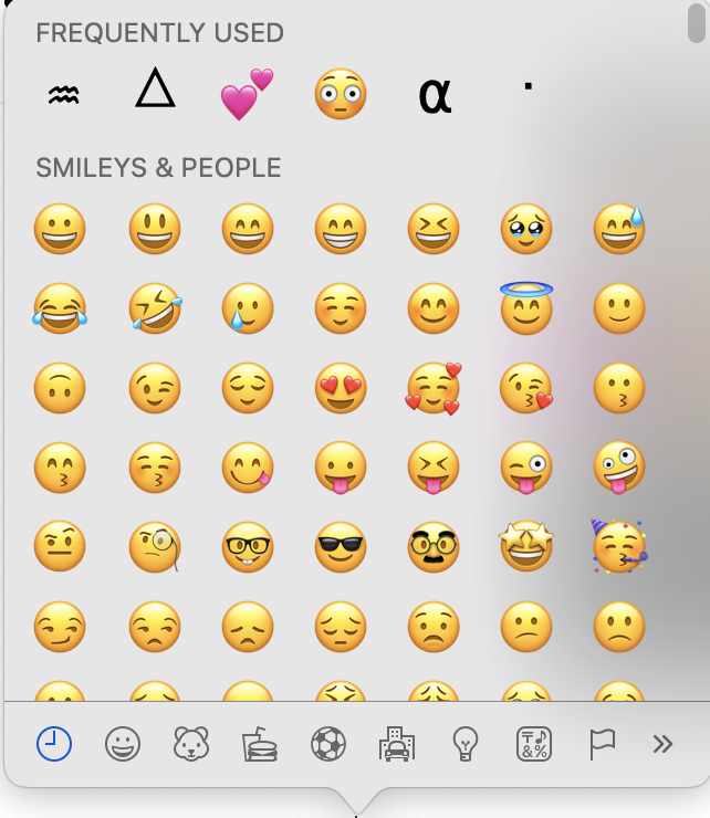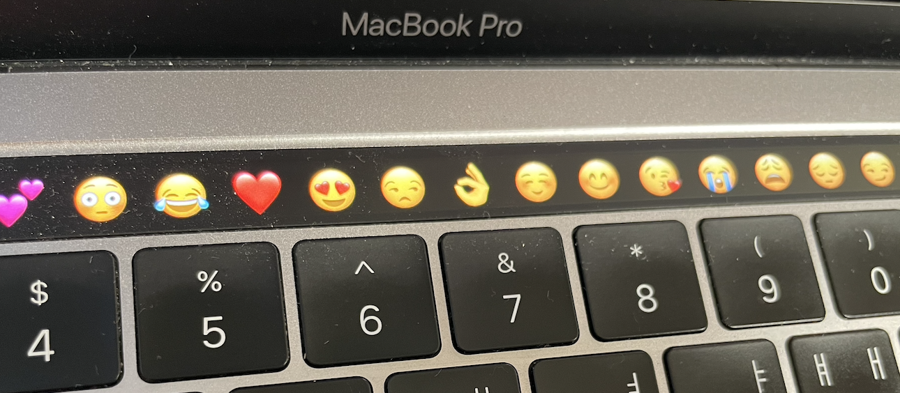 터치 바가 있는 맥북 프로를 사용 중이라면 이모티콘이 아이콘이 터치 바에 있어 바로 터치하여 원하는 이모티콘을 선택할 수 있다. 그런 경우가 아니라면 Control + Commend + Space를 누르면 된다.
