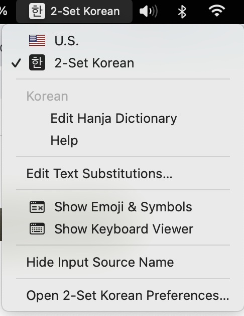 또는 메뉴바 상단에 한/영 변환 부분을 "이모지/심블 보이기"를 클릭해도 된다.