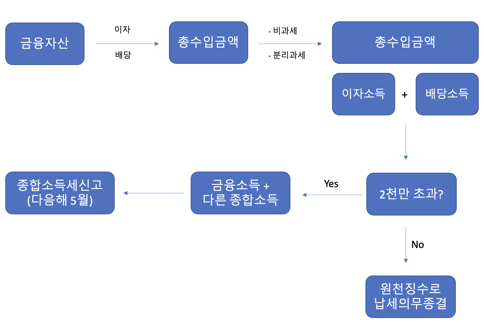 2천만 원 X 14% +(2천만 원 초과 금융소득 + 타 종합소득 - 소득공제) X 누진세율