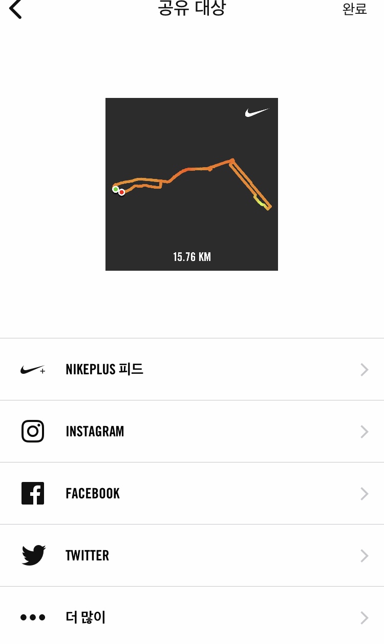 개별 러닝 결과의 하단에 러닝 공유하기를 클릭하면 러닝 결과에 대해 나이키 플러스 피드, 인스타그램, 페이스북, 트위터 등의 소셜 미디어에 포스팅할 수 있다.