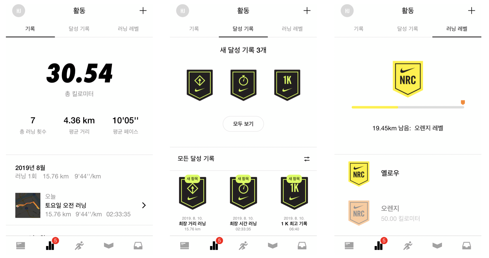 아래 그래프는 아이콘을 클릭하면 지금까지 총 달린 거리 및 러닝 횟수와 자세한 기록을 확인할 수 있다. 러닝 기록뿐만 아니라 러닝에 대한 동기 부여를 위해 여러 가지 달성 기록에 대한 배지도 제공한다. 누적 러닝 거리에 따라 레벨도 구분되어 있다.