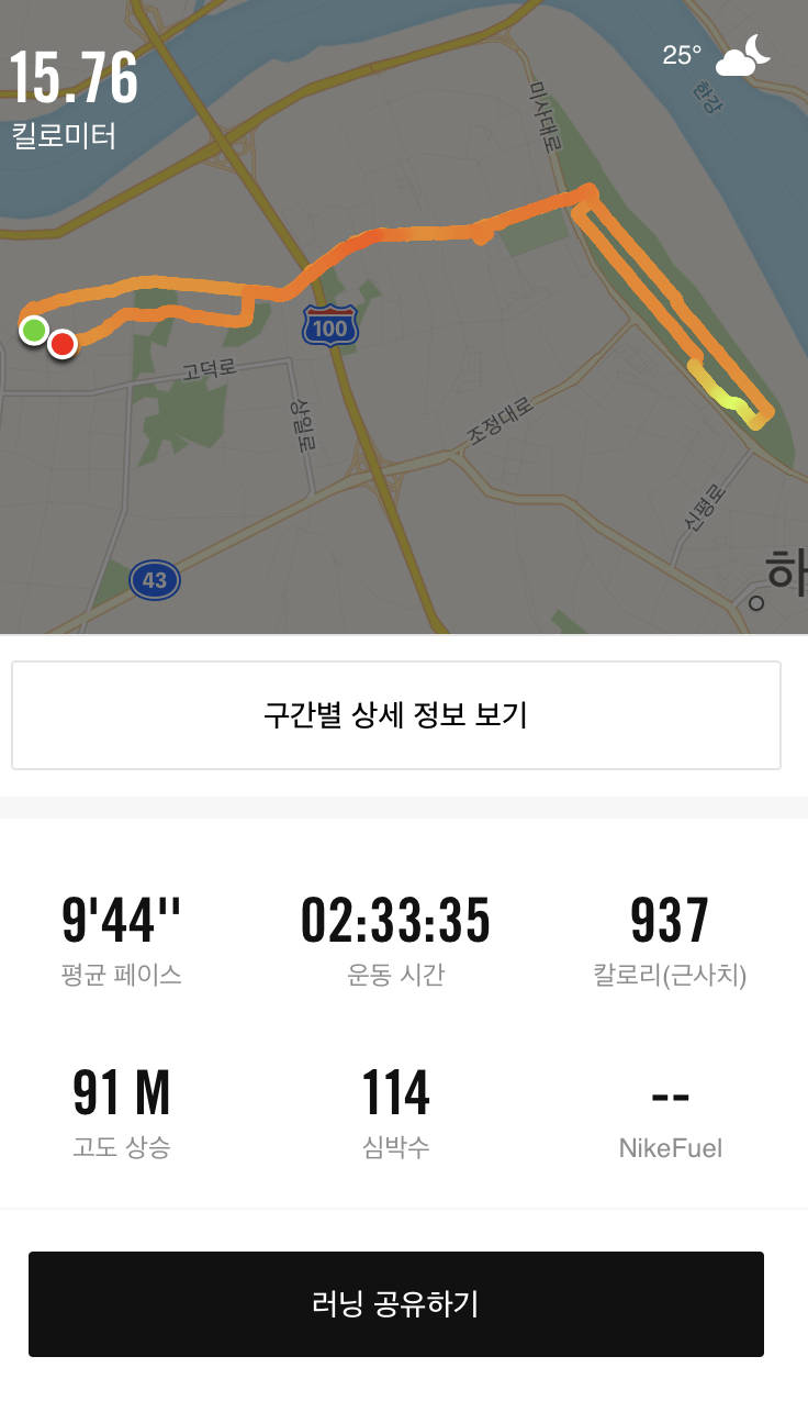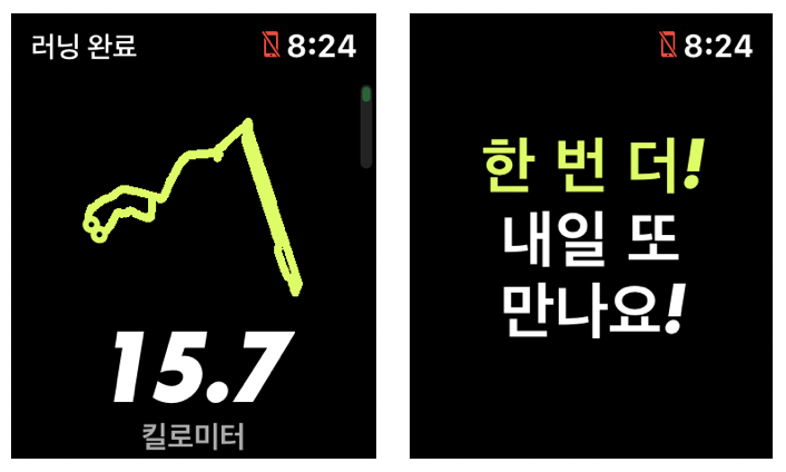 이미 완료한 러닝 결과에 대해 애플 워치에서 km당 페이스를 확인할 수 있는 정도이고, 아이폰을 통해 보다 상세한 정보를 확인할 수 있다.