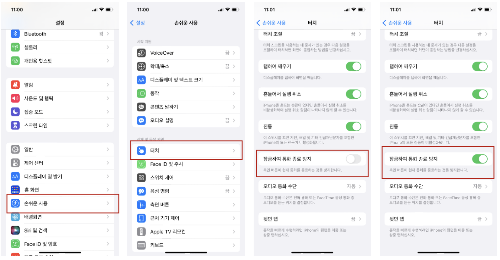 4) 아래로 스크롤하여 잠금하여 통화 종료 방지를 ON상태로 한다.