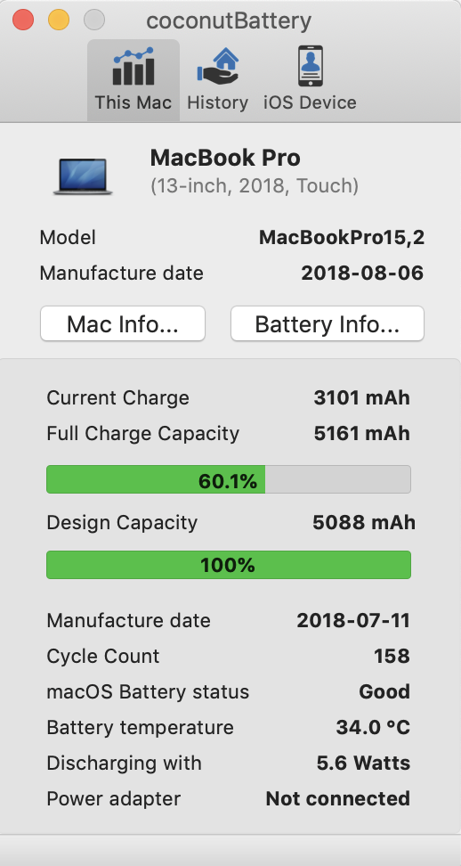 배터리 상태 정보 프로그램이지만 Mac 정보 탭에는 모델명, 제조일자, 시리얼, OS 버전을 확인할 수 있다. 배터리 정보 탭에는 배터리 제조사, 제조일자, 배터리 사용일, 충전 횟수, 시리얼 번호, 온도 정보 등을 확인할 수 있다.