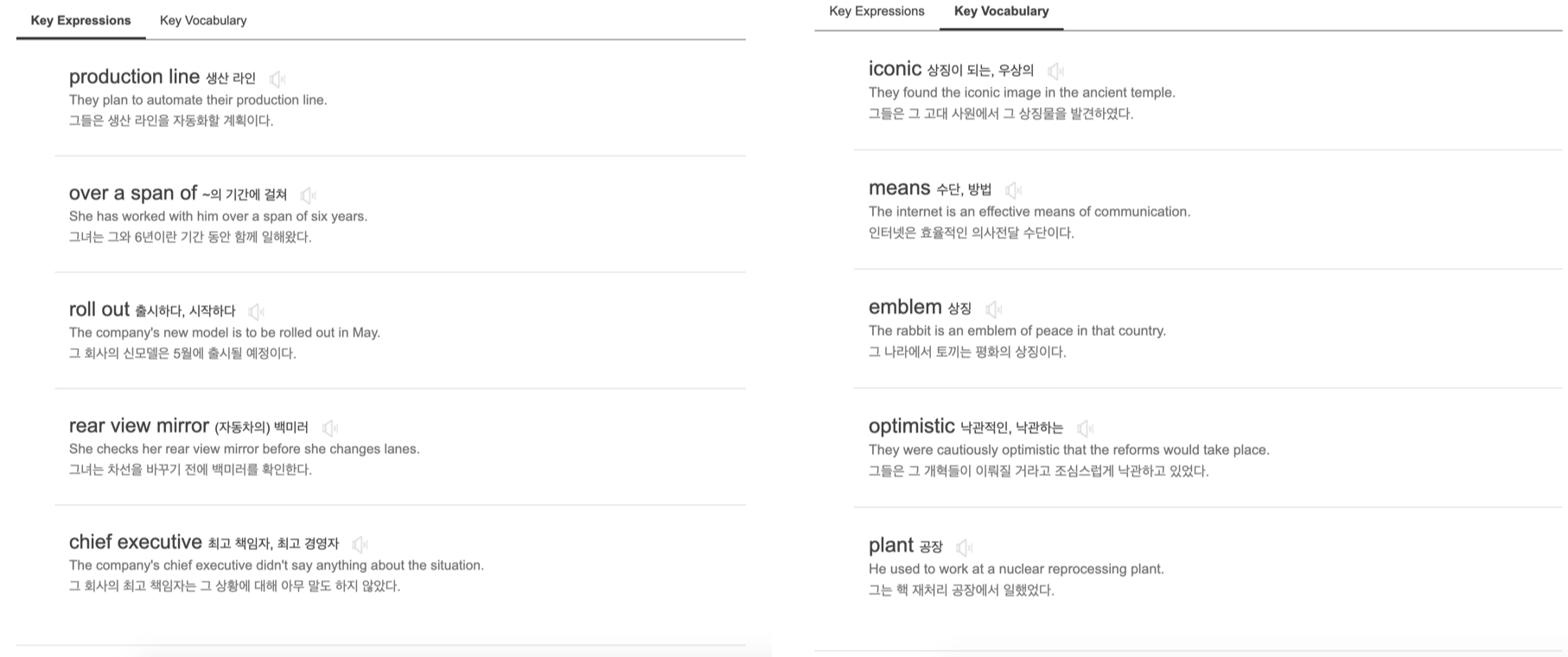 아래에는 Key Expressions, Key Word를 제시해주고 있습니다. 이후 Next버튼을 클릭하면 Shadowing, Dictation을 위한 페이지가 준비되어 있습니다.