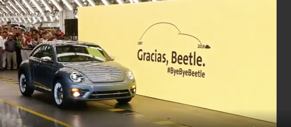 "Volkswagen's iconic Beetle received a send-off complete with marianshis on Wednesday as the very late one rolled off the production line in Pulebla, Mexico."