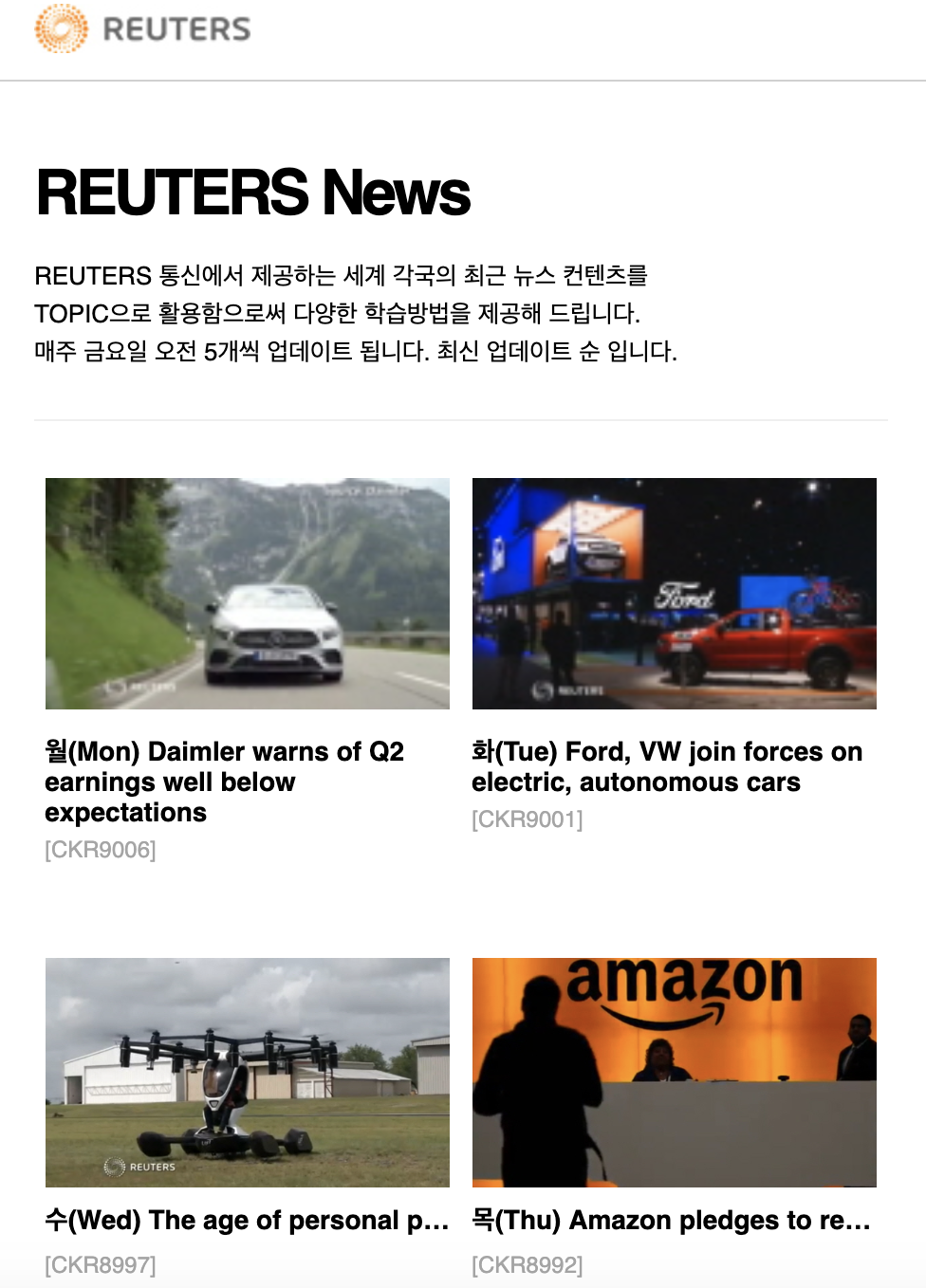 아래의 링크는 RUTERS 통신에서 제공하는 세계 각국의 최근 뉴스 콘텐츠를 TOPIC으로 활용함으로써 다양한 학습방법을 제공하고 있습니다. 매주 금요일 5개씩 업데이트되고 있습니다.