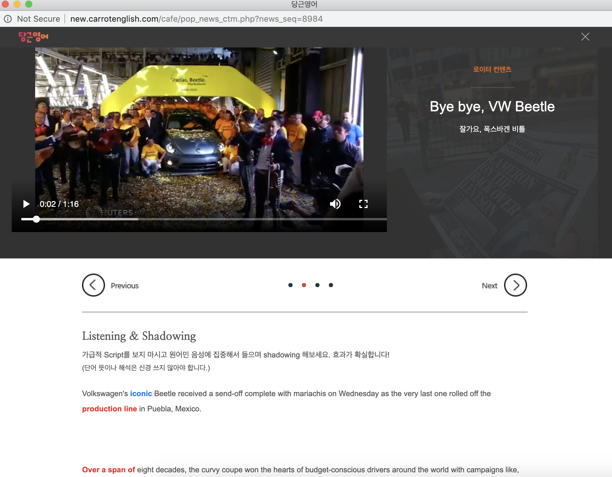 Breaking News English는 영어 뉴스 기사의 원문을 발췌하여 셀프 스터디를 위해 가공되어 있는 무료 사이트입니다.