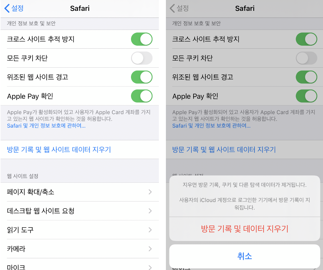 이렇게 하면 모든 웹 사이트에서 캐시와 기록, 쿠키 등이 삭제되며 웹에서 로그인한 항목이 로그 아웃됩니다. 또한 iCloud 계정을 사용하는 모든 기기에서 이 정보가 지워집니다.