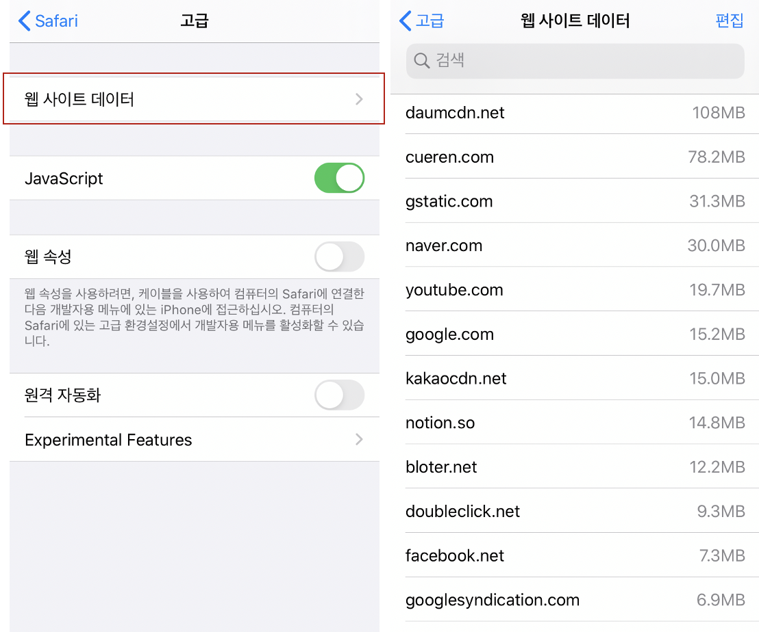 사파리의 옵션에서 "웹 사이트 데이터"를 선택하면 아이폰 또는 아이패드에 데이터를 저장 한 모든 사이트 목록이 표시됩니다. 오른쪽 상단의 "편집"을 선택한 다음 지우려는 각 항목의 왼쪽에 있는 삭제 기호를 누르면 개별 삭제가 가능합니다.