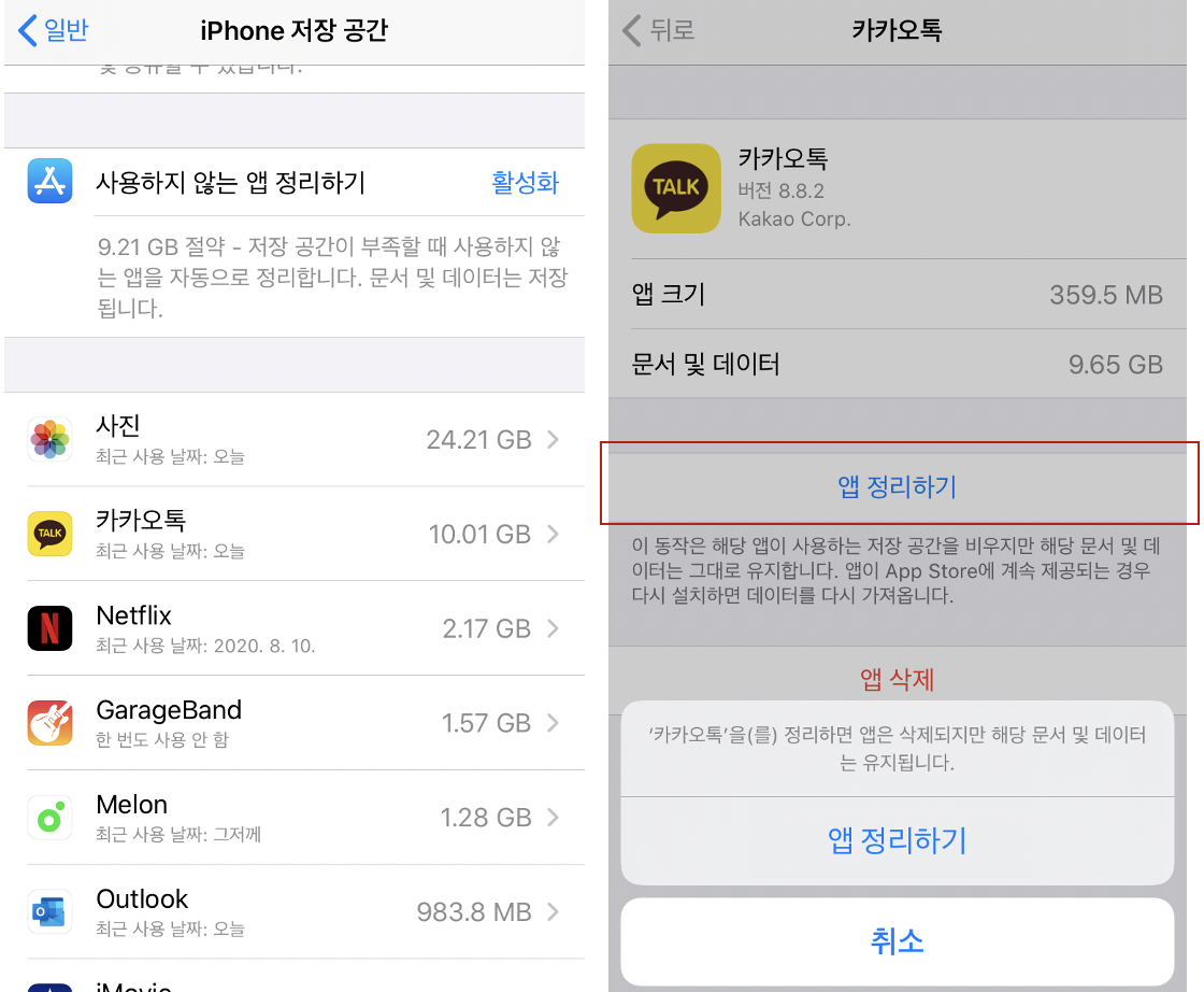 "앱 정리하기"를 클릭하면 차지하고 있는 용량만큼을 확보할 수 있습니다. 카카오톡의 경우 장시간 사용하면 오래된 채팅창이 많아지고 데이터가 누적되어 가끔씩 활용하여 안정적으로 아이폰의 저장 용량을 확보할 수 있습니다.