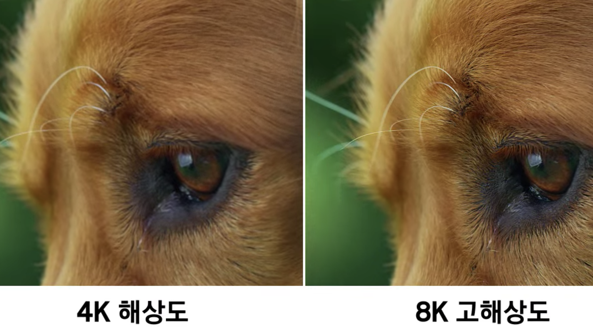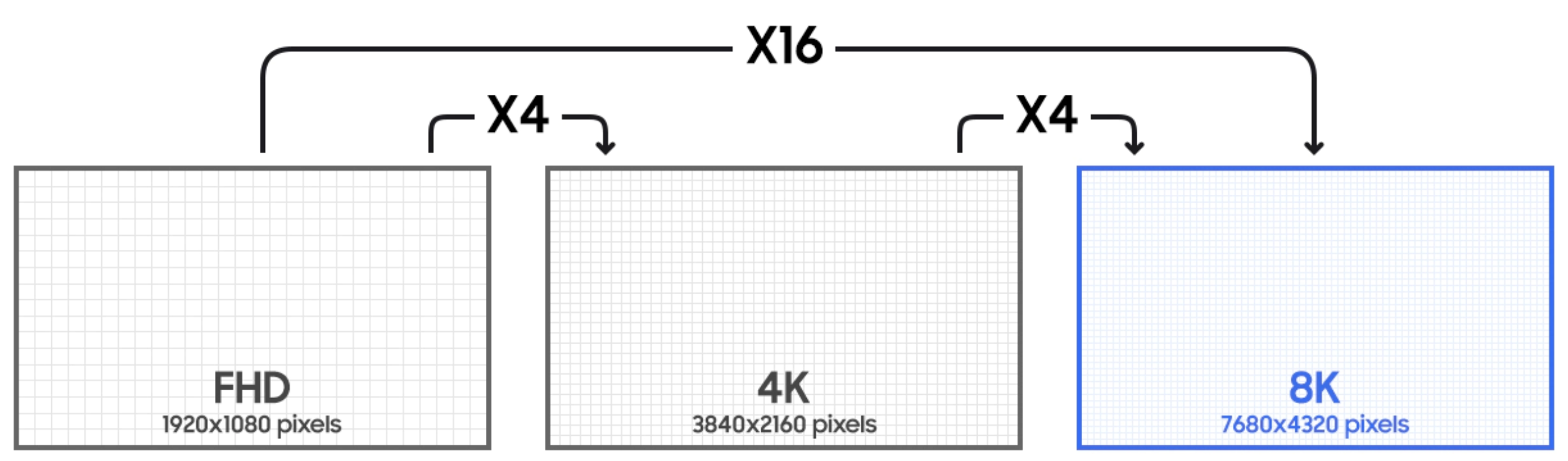 7620x4320의 해상도를 나타내는 8K라고 도하는 Full Ultra HD도 있습니다. 8K는 가로 7680개, 세로 4,320개로 총 약 3,300만 개의 픽셀 화면으로 이루어져 있습니다. 8K QLED TV는 삼성에서 출시한 예로 들 수 있습니다. 4K에 대비하여 4배의 픽셀 조합으로 아주 작은 디테일까지 정밀하게 구현해 눈앞에 있는 것 같은 깊이감과 현장감을 줄 수 있다는 것이 삼성 측의 설명입니다.