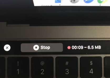 옵션 버튼을 클릭하면 녹화를 저장할 위치를 선택하고 카운트 다운 타이머를 시작하여 녹화를 시작할 수 있습니다. 자신의 음성 또는 외부 오디오를 녹음하는 경우는 맥의 마이크 사용 옵션을 확인하시기 바랍니다. 맥북 프로 터치바를 사용하고 있어 화면 녹화가 시작되면 아래와 같이 녹화 시간과 저장 용량을 확인할 수 있습니다.