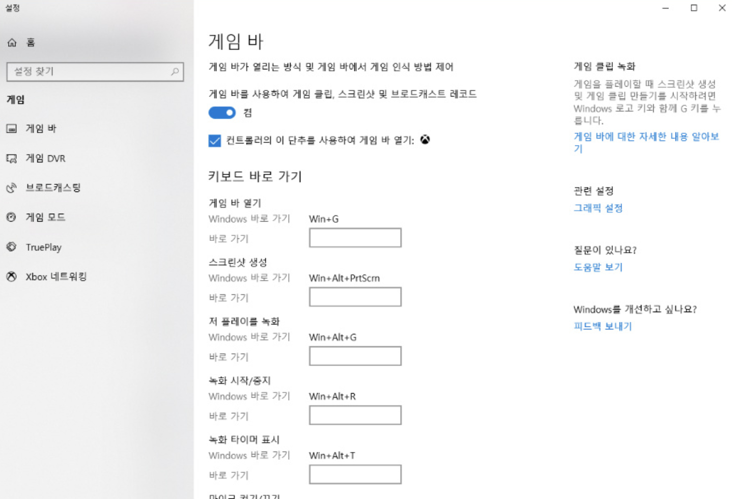 게임바를 사용하여 게임 클립, 스크린샷 및 브로드 캐스트 레코드 스위치를 켬으로 변경합니다. 여기에는 게임바 열기, 스크린 샷 찍기, 비디오 녹화와 관련된 키보드 단축키를 변경할 수 있습니다.