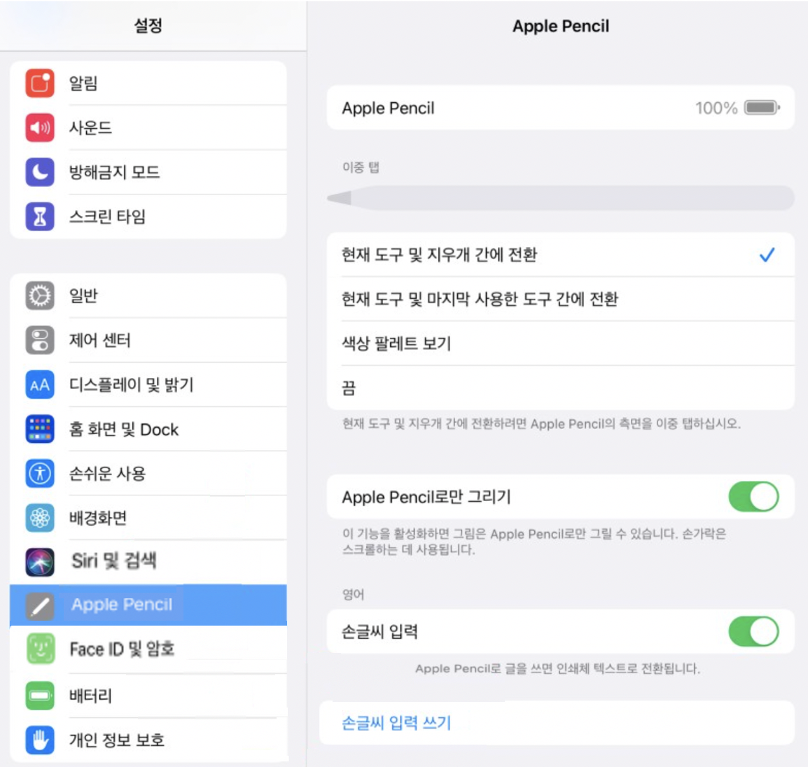2세대 애플 펜슬의 이중 탭 기능은 지우개를 활성화하는 것 이외에 다른 작업을 수행하려 하는 경우 이용할 수 있습니다. 이를 설정하려면 "설정 앱 > Apple Pencil"로 이동합니다.