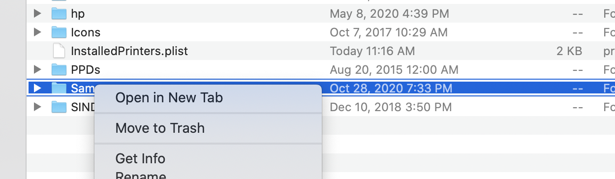 맥 OS 환경에서 드라이버 관련한 상세 파일은 일반적인 파일 탐색기 경로로 확인이 안 된다. 간단한 방법으로는 맥 OS 내에 Spotlight를 실행 후 "/Library/Printers/"를 입력하면 아래와 같은 경로로 이동한다.