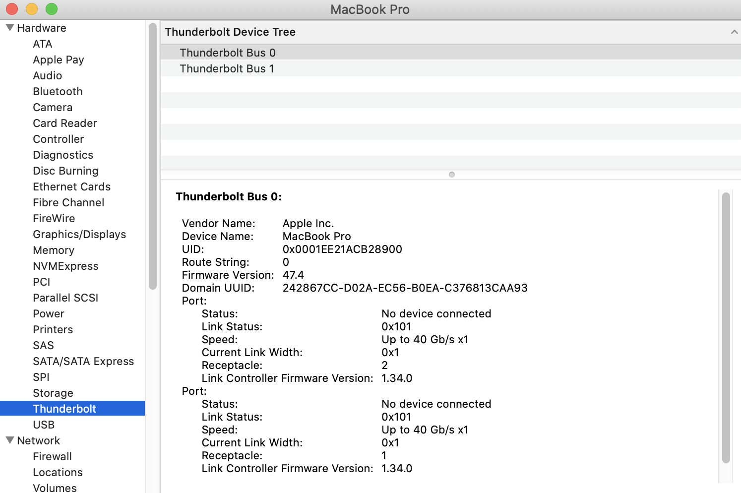 현재 사용하는 맥북에는 좌우 2개씩 4개의 포트가 있어서 Thunderbolt Bus0,1로 나타나는 것을 확인할 수 있다.