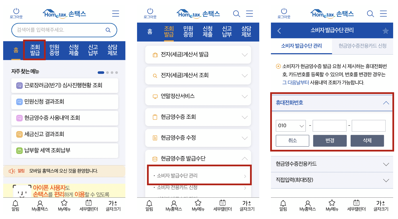 홈텍스앱(국세청 손택스) > 로그인 > 조회/발급 > 현금영수증 발급수단