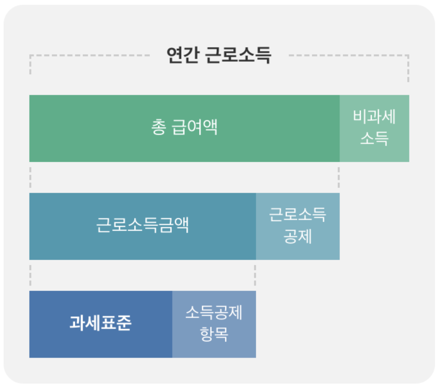 과세 표준을 구하기 위해서는 총급여액을 알아야 한다. 1년간의 총급여액은 12개월의 월급 및 상여금을 포함한 근로소득에서 비과세소득을 제외한 금액이다. 비과세 소득은 식대, 출산/보육수당 등으로 직장인인 근로자에게 세금이 부과되지 않는다.