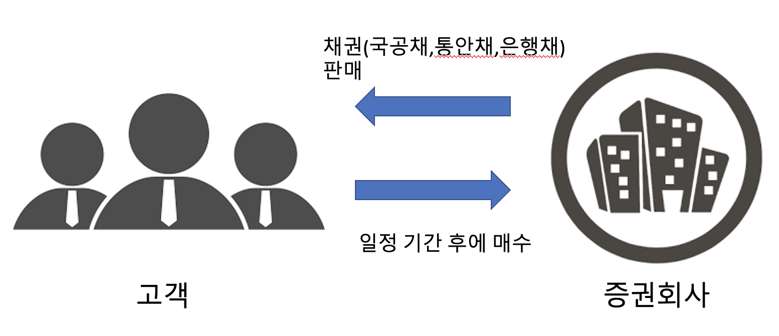 환매 조건부 채권이라고 하며 증권회사가 보유하고 있는 채권(국공채, 통안채, 은행채 )등을 일정 기간 후에 다시 매수하는 것을 조건으로 고객에게 판매하는 단기금융상품이다. 확장 금리를 제공하는 것이 특징이다. 단기 여유 자금, 주식 매수용 대기 자금 등을 단기간 운용할 때 유리하다.