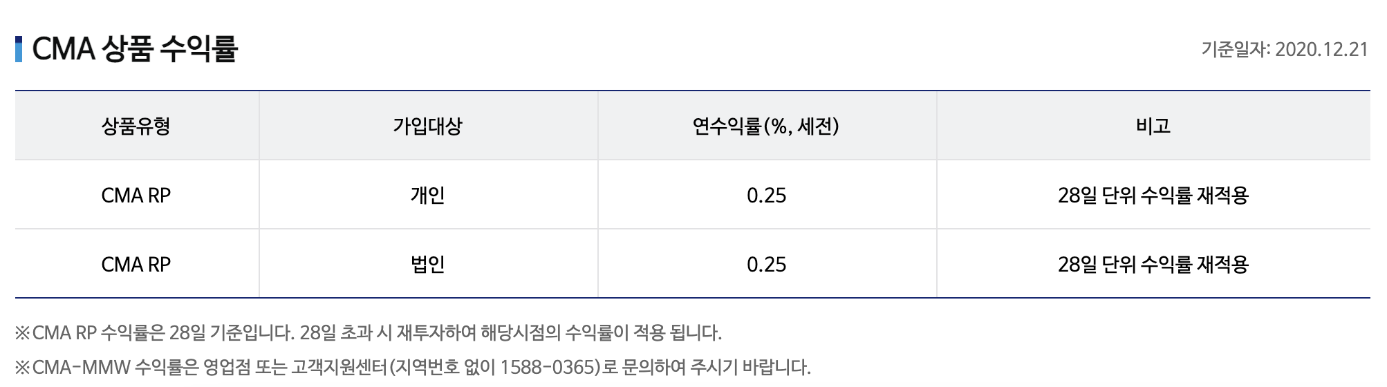 | MMW / MMW형 CMA | 실적배당 | 일일정산을 통한 복리 효과 있음 | 증권사 운용 |
