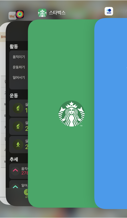 실행 중인 백그라운드 앱이 너무 많다고 생각되면 화면을 위로 쓸어 올려 더 이상 사용하지 않은 앱을 닫도록 한다.