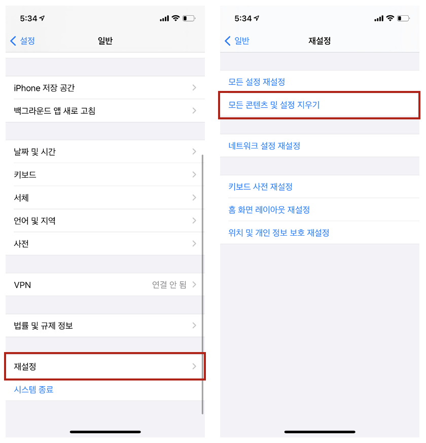 재설정을 택한 후 모든 콘텐츠 및 설정 지우기를 선택하면 된다. 이를 실행하기 전에 반드시 백업을 진행하는 것이 좋다.