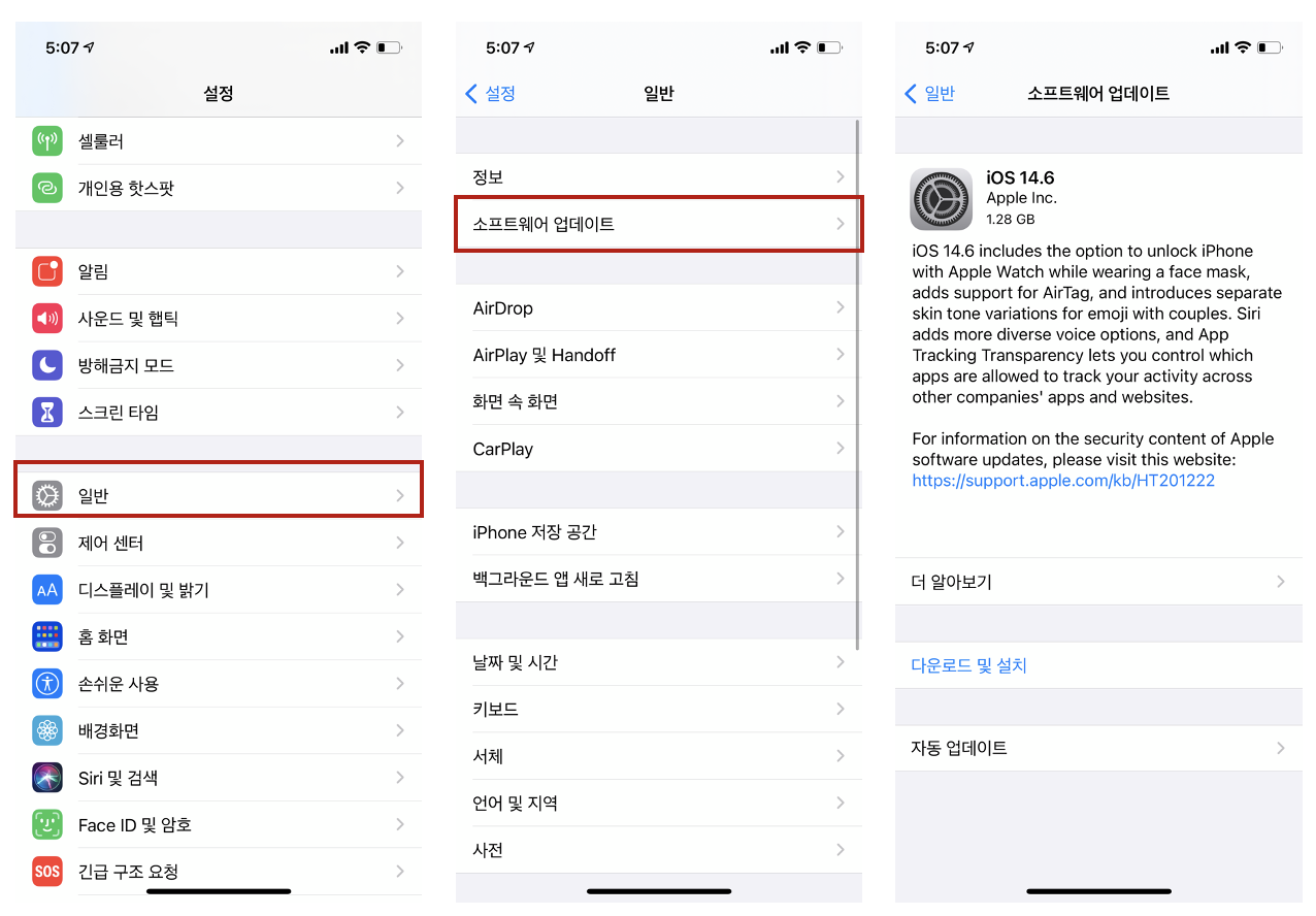 2. 소프트웨어 업데이트를 탭 한다. 아래의 경우는 iSO 14.6 업데이트가 필요함을 알 수 있다.
